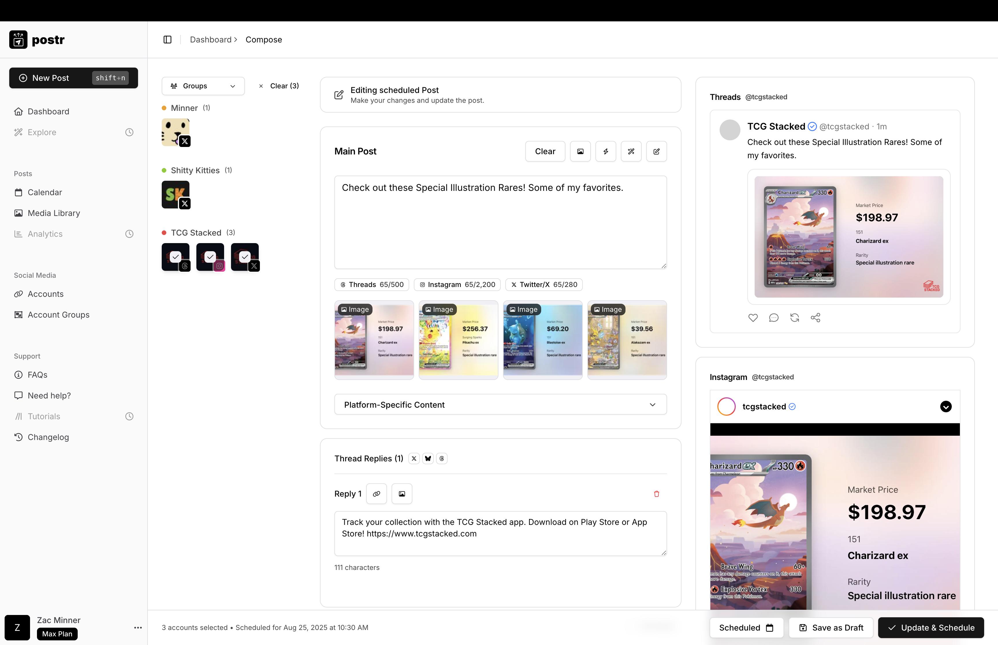 Create, edit, and manage post drafts before scheduling or publishing across your connected accounts.